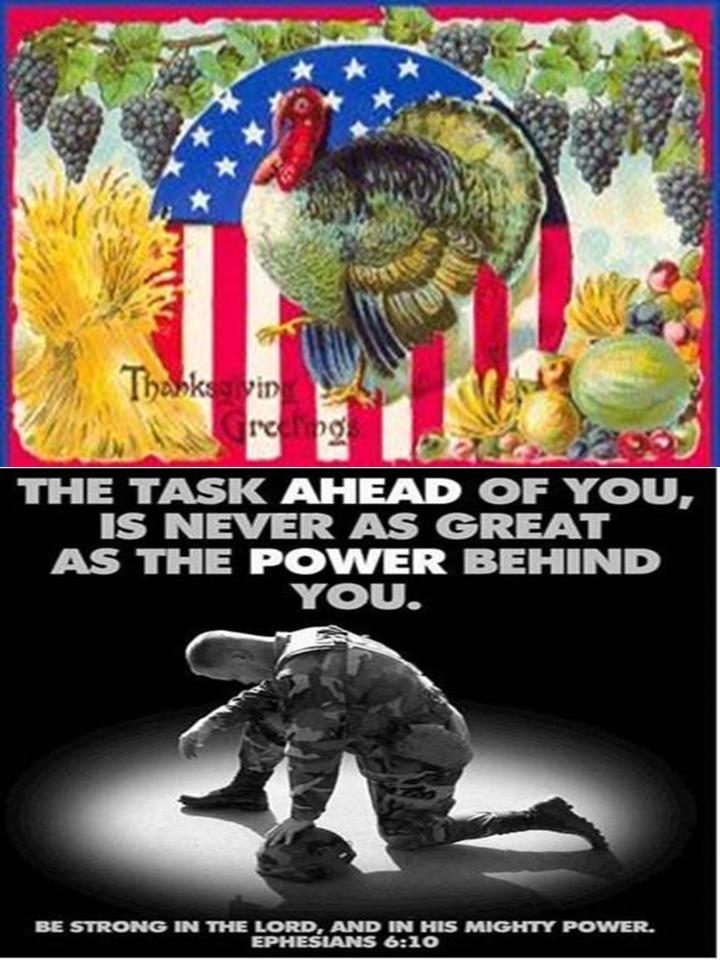 As we all prepare for Thanksgiving, we hold a special place in our hearts and prayers for the brave men and women serving in our nation's military. We hope you and your families know that your sacrifices are appreciated and will never be forgotten. Thanks for doing what you do to protect our freedoms here at home and for others around the world. May God bless you and your families on this special day of thanks.With gratitude,